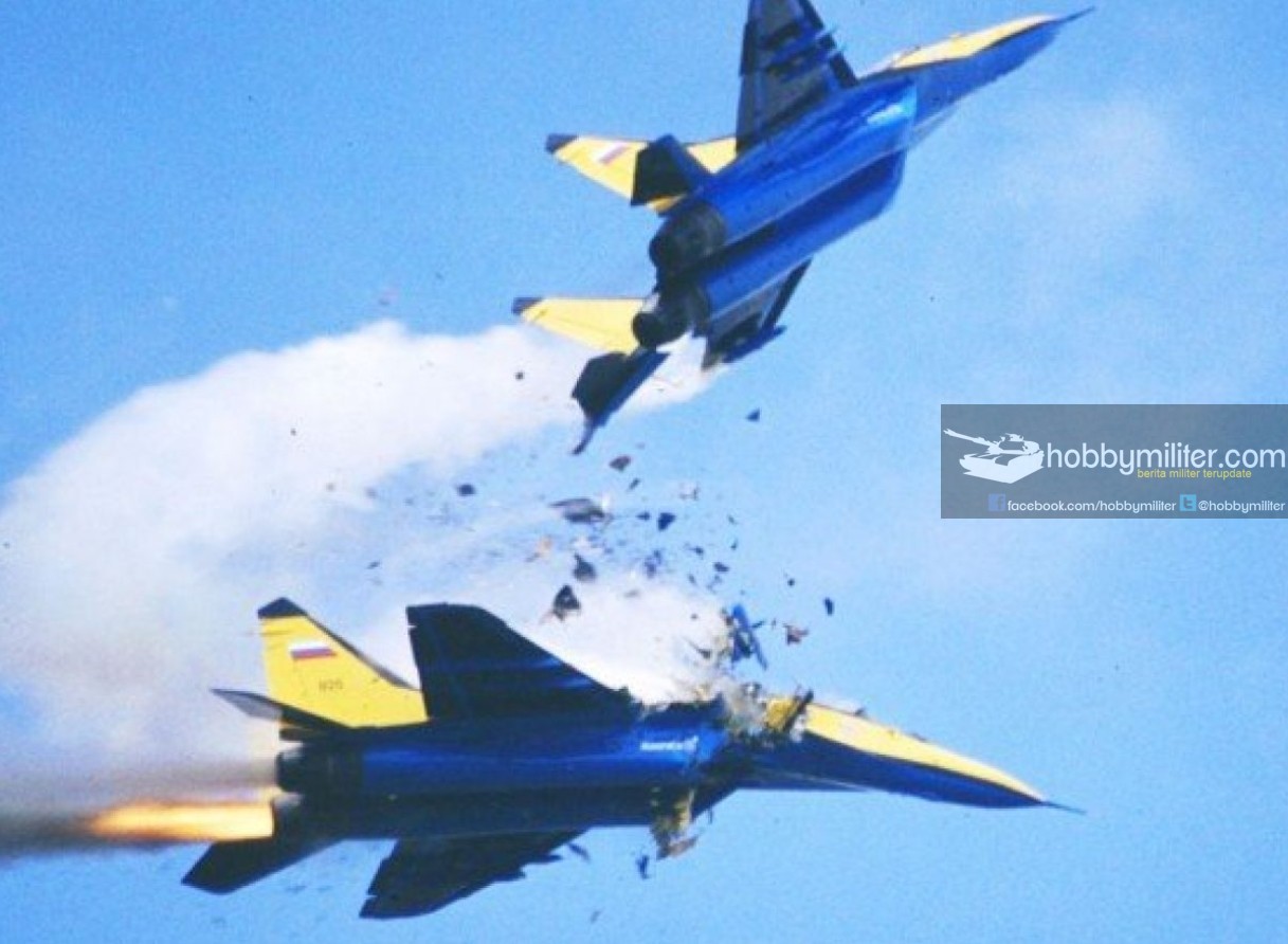 Kedua pesawat bersenggolan ketika melakukan manuver saling mengguntingdan salah satu pilot kehilangan orientasi lokasi pesawat rekannya. Setelah patah diudara, pesawat MiG 29 tersebut terbakar dan jatuh ke bumi dan menjadi gumpalan bola api.