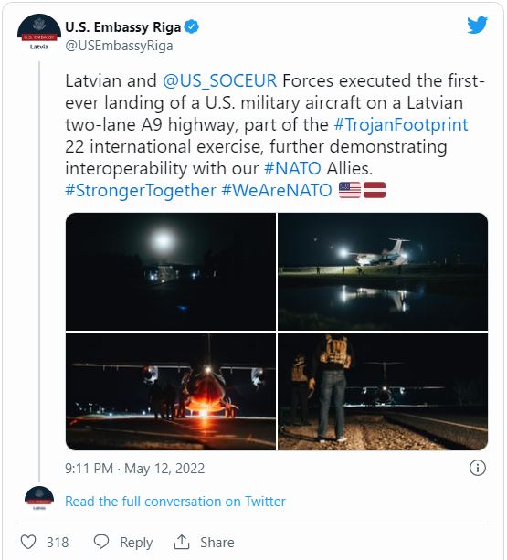 C-146A Wolfhound Milik AS Tuntaskan Misi Terbang Dari Jalan Raya Di Latvia. Tangkapan Layar Postingan Akun Twitter Milik Kedubes AS Di Riga Tentang Pendaratan Pesawat C-146A Wolfhound Di Jalan Raya A9 Di Latvia.