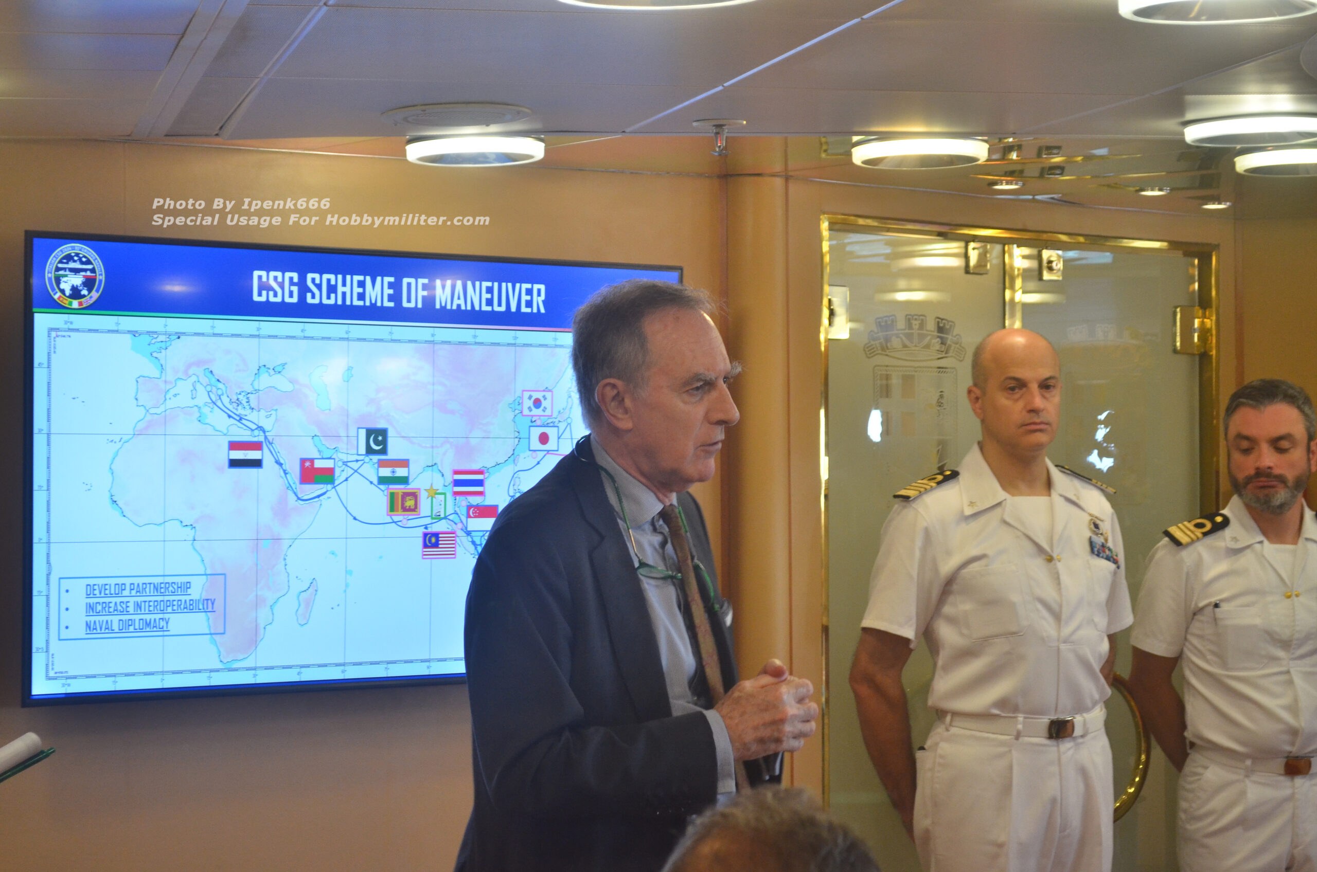 Kegiatan pertama yang kami ikuti adalah Konferensi Pers yang dihadiri oleh beberapa figur penting diantaranya Duta Besar Italia untuk Indonesia, Timor-Leste, dan ASEAN, Mr. Benedetto Latteri; Deputy Chief of Italian Navy, Vice Admiral Giuseppe Berutti Bergotto; Italian Carrier Strike Group Commander (Komandan Gugus Tempur Kapal Induk Italia), Rear Admiral Giancarlo Ciappina; serta Commander Air Wing (Komandan Wing Udara) Gugus Tempur Kapal Induk Italia, Captain Dario “ZAZA” Castelli. Dalam Konferensi Pers tersebut, disampaikan bahwa kehadiran Gugus Tempur Kapal Induk Italia Cavour ke wilayah perairan Indo-Pasifik merupakan deployment pertama dari unsur kekuatan tempur AL Italia khususnya Carrier Strike Group mereka di wilayah Asia-Pasifik. Dalam jumpa pers tersebut, dijelaskan juga bahwa misi utama kedatangan rombongan kapal induk dan kapal perang milik AL Italia ke Indonesia kali ini adalah untuk meningkatkan kerjasama serta hubungan baik antara Angkatan Laut Italia (Marina Militare) dengan TNI Angkatan Laut yang sudah terjalin dengan baik sejak masa-masa sebelumnya.