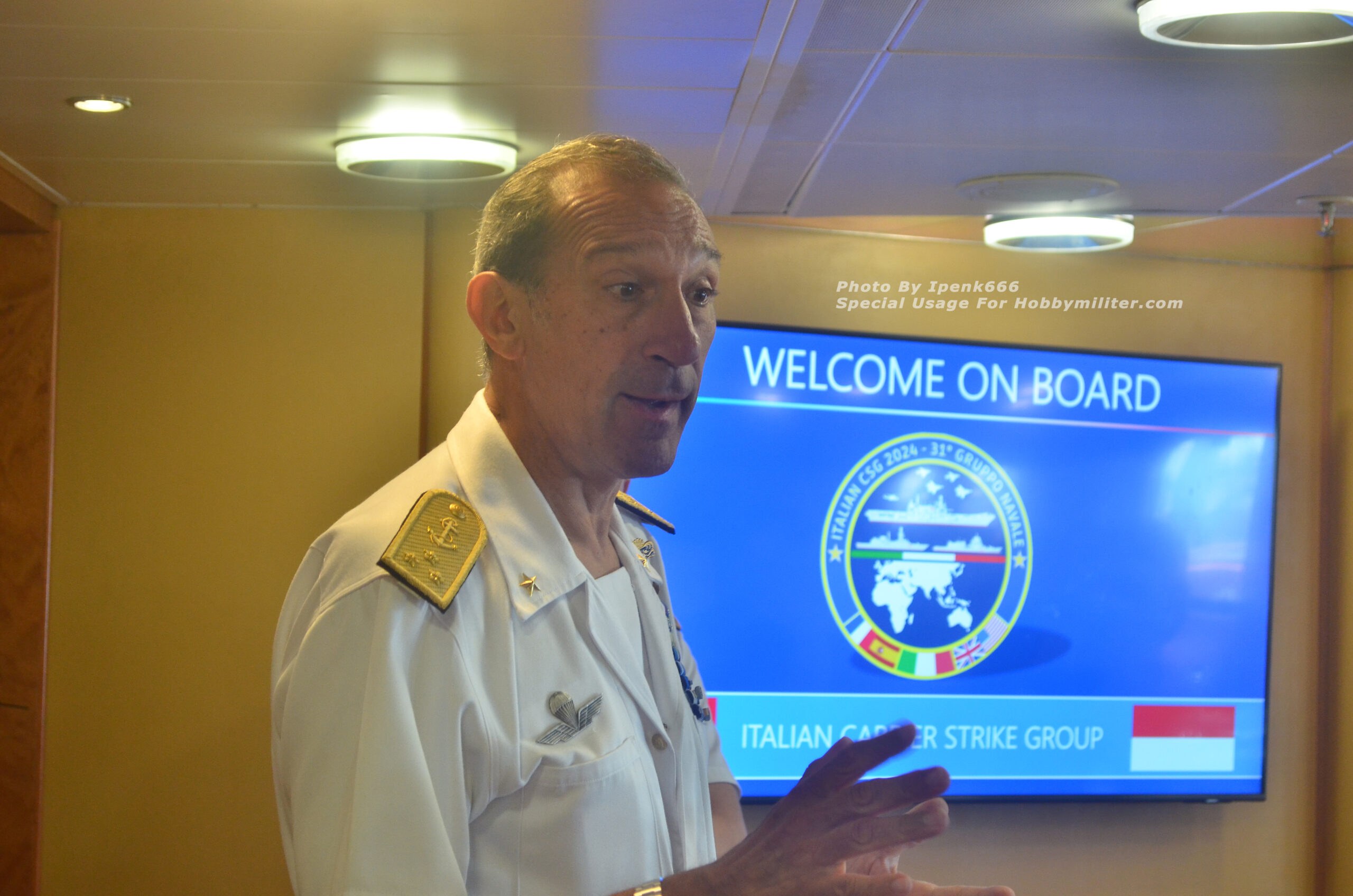 Dalam kesempatan yang sama, para awak media juga mendapatkan penjelasan terkait unsur apa saja yang terlibat dalam misi Italian Navy Carrier Strike Group 31 Gruppo Navale di kawasan Indo-Pasifik tahun 2024 ini. Angkatan Laut Italia (Marina Militare) mengirimkan 3 kapal perang dengan komposisi 1 unit kapal induk ITS Cavour C-550, 1 unit kapal perang Multi-Purpose Combat Ship PPA ITS Raimondo Montecuccoli P-432, dan 1 unit kapal perang Frigate FREMM ITS Alpino F-594. Kapal Induk ITS Cavour C-550 sendiri membawa sebanyak 15 unit pesawat jet tempur dengan komposisi 7 unit pesawat jet tempur AV8B Harrier II, dan 8 unit pesawat jet tempur generasi ke-5 dengan kemampuan stealth F-35B Lightning II. Disamping pesawat tempur, terdapat pula 3 unit helikopter NH-90 yang turut dibawa oleh kapal induk tersebut. Disamping membawa personel aktif, ITS Cavour juga membawa personel kadet 2nd Class Midshipman yang turut serta dalam pelayaran Italian Navy CSG 2024 ini dalam rangka training bagaimana menjalani misi sesungguhnya sebagai anggota Angkatan Laut Italia (Marina Militare). Pada kesempatan tersebut, pihak Italia juga mengapresiasi terkait pengiriman sebanyak 5 (lima) orang Anggota TNI Angkatan Laut guna melaksanakan On the Job Training diatas kapal perang Multi-Purpose Combat Ship PPA ITS Raimondo Montecuccoli P-432 dalam rangka mempersiapkan kedatangan unit pertama kapal perang Multi-Purpose Combat Ship PPA pesanan TNI Angkatan Laut pada waktu yang akan datang.