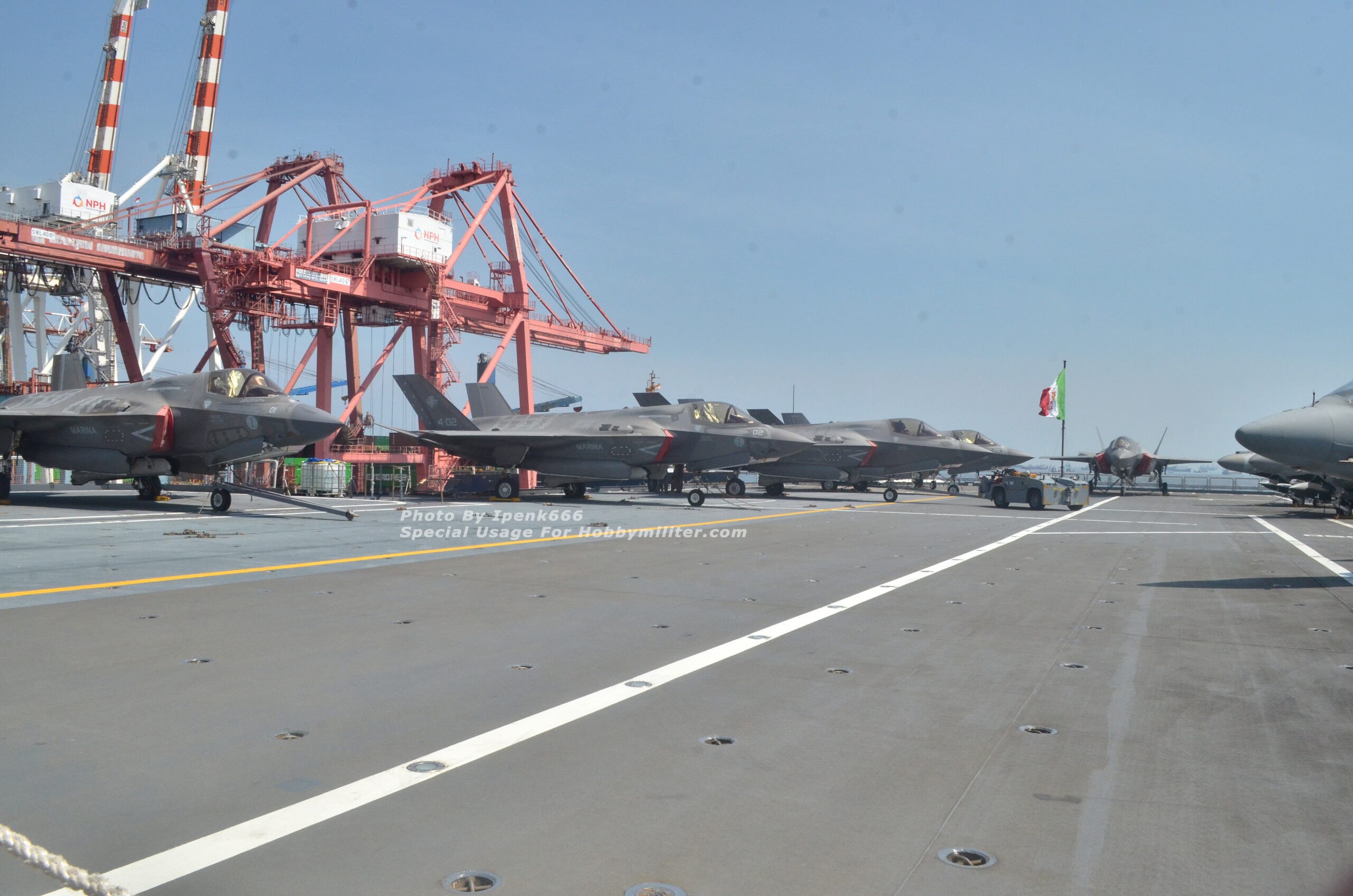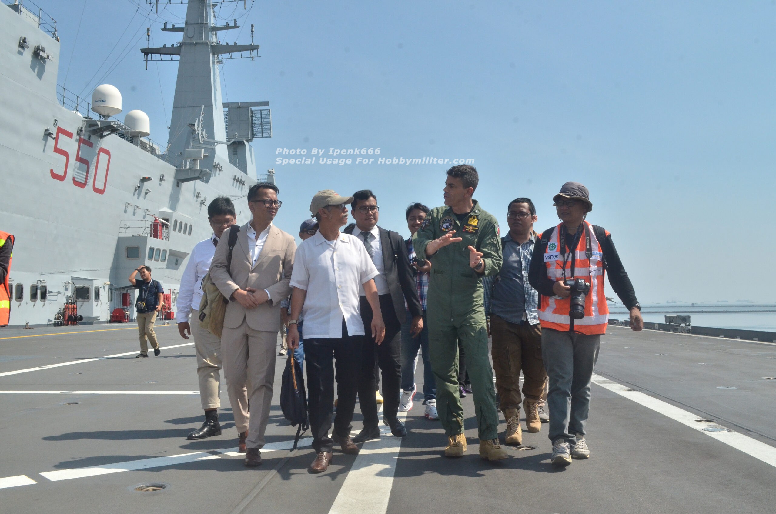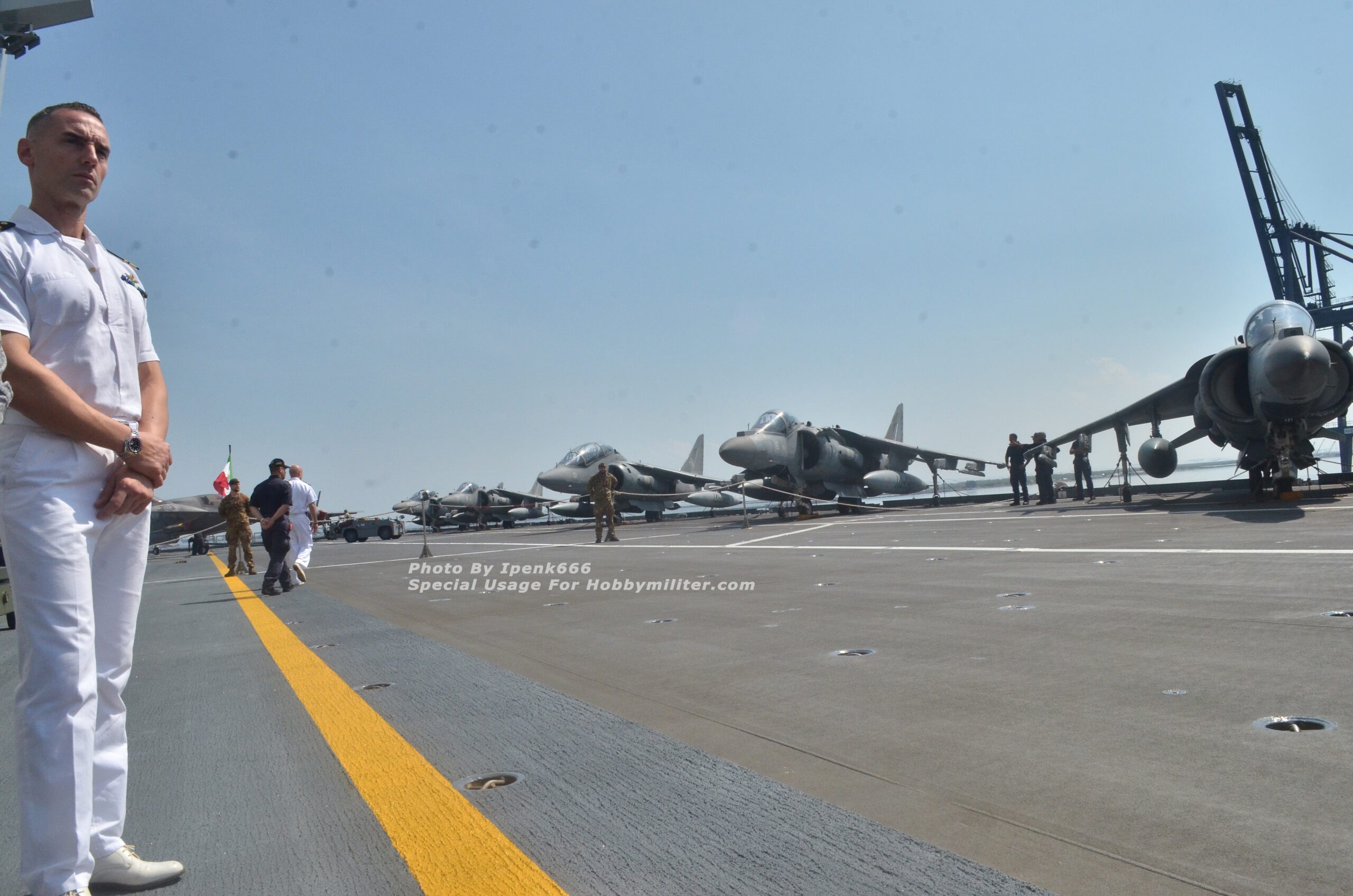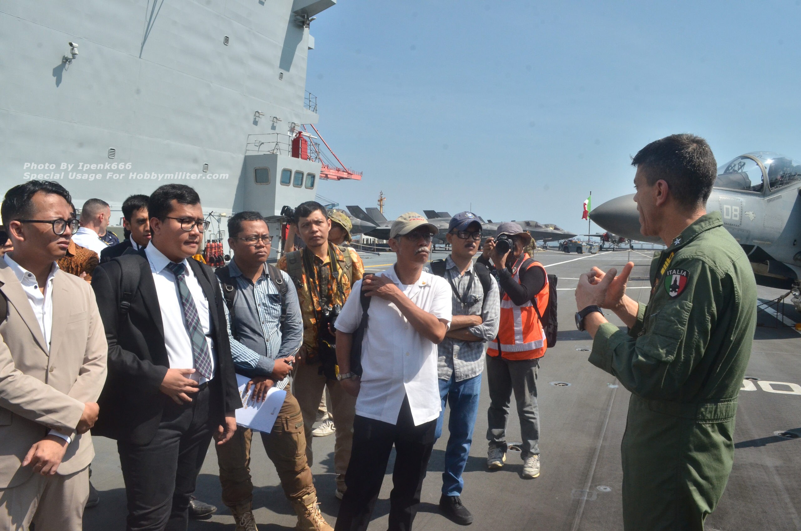 Setelah selesai mendapatkan penjelasan terkait kegiatan Gugus Tempur Kapal Induk Italia di Indo-Pasifik, komposisi unsur kapal-kapal perang yang terlibat, serta para pengawaknya, dan briefing khusus soal aturan keamanan serta larangan-larangan (do and don’t) dalam sesi foto di area flight deck, kegiatan dilanjutkan dengan tur singkat pada area geladak landas pacu atau geladak penerbangan (flight deck) dimana pesawat-pesawat jet tempur AV8B Harrier II, F-35B Lightning II, serta helikopter NH90 biasa disiagakan. Diatas flight deck, Commander Air Wing (Komandan Wing Udara) Gugus Tempur Kapal Induk Italia, Captain Dario “ZAZA” Castelli memberikan penjelasan secara umum terkait upaya Italia dalam mengejar status Initial Operational Capability atau IOC untuk armada jet tempur generasi ke-5 nya yakni F-35B Lightning II, sekaligus memberikan penjelasan komparasi pengoperasian kedua jenis pesawat yakni AV8B Harrier II dan F-35B Lightning II. Dibawah pengawasan para perwira Marina Militare, awak media diperkenankan mengambil beberapa foto di area flight deck, tentu dengan tidak melanggar aturan yang sudah dijelaskan sebelumnya di ruang Lounge Room ITS Cavour C-550.