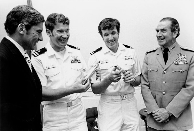 Ketika kembali ke USS Constellation, mereka disambut dengan kegembiraan. Tangan melambai-lambai dan dan tanda V diacung-acungkan. Sebuah sepanduk yang ditulis cepat terpampang. “Selamat kepada Letnan Driscoll dan Letnan Cunningham.”