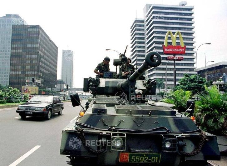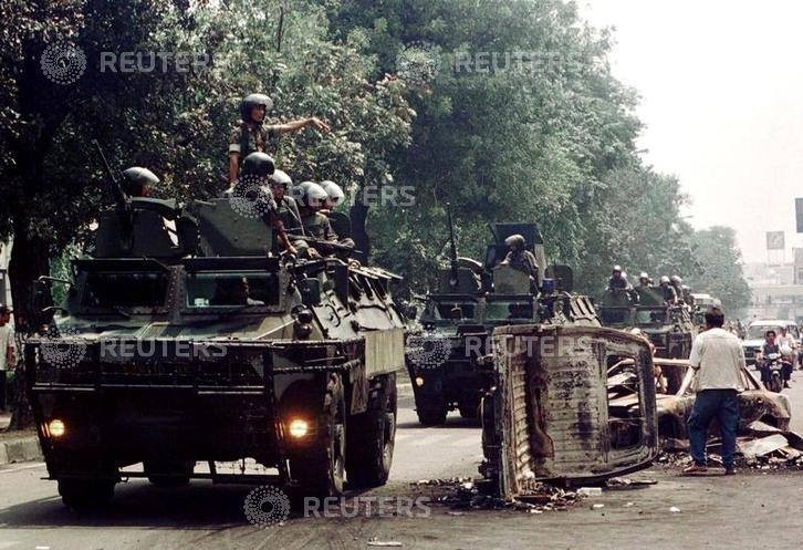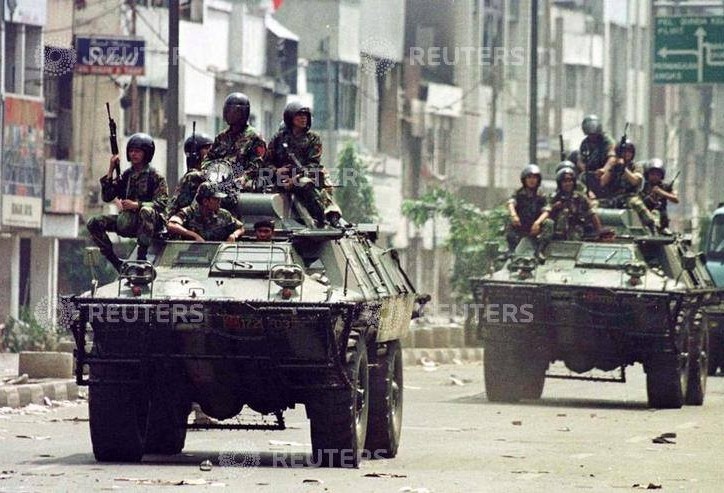 Sepasukan tentara diatas APC VAB buatan Perancis berpatroli di tanggal 15 Mei 1998 setelah 3 hari penuh kekerasan, penjarahan dan kerusuhan. Patroli ini melewati puing puing kendaraan yang dibakar oleh massa. Jakarta dinyatakan lumpuh selama 3 hari ini dan banyak negara mengungsikan warga negaranya yang tinggal di Jakarta melalui Bandara Soekarno-Hatta. Presiden Suharto memutuskan mempercepat lawatan luar negerinya dan kembali ke Jakarta untuk menangani krisis ini. Foto Reuters, 15 Mei 1998.
