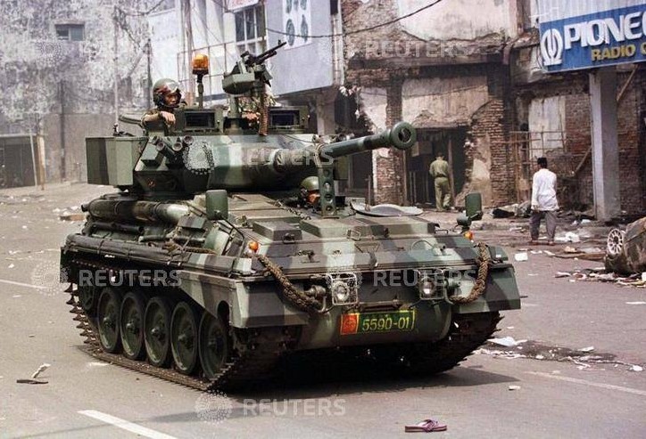 Tank Scorpion melakukan rolling thunder di seantero kota, 15 Mei 1998. Selama 3 hari berturut turut 12-14 Mei 1998, kerusuhan berkobar di Jakarta dan di hari ini, 15 Mei 1998 pun masih terjadi beberapa kejadian di penjuru Jakarta. Panglima ABRI telah memerintahkan jajarannya untuk melakukan pengamanan maksimal dengan mengerahkan satuan satuan tempur di jalanan ibu kota. Foto Reuters, 15 Mei 1998.