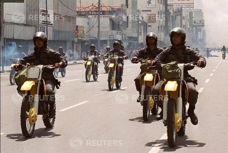 Tidak hanya pasukan kavaleri. Tentara juga menurunkan pasukan buru sergap bermotor yang berpatroli di sepanjang jalan Hayam Wuruk – Gajah Mada. Kawasan Glodok merupakan salah satu sasaran utama massa yang menjarah dan membakar dari tanggal 12 Mei 1998. Foto Reuters, 14 Mei 1998. [Bersambung ke halaman berikut]