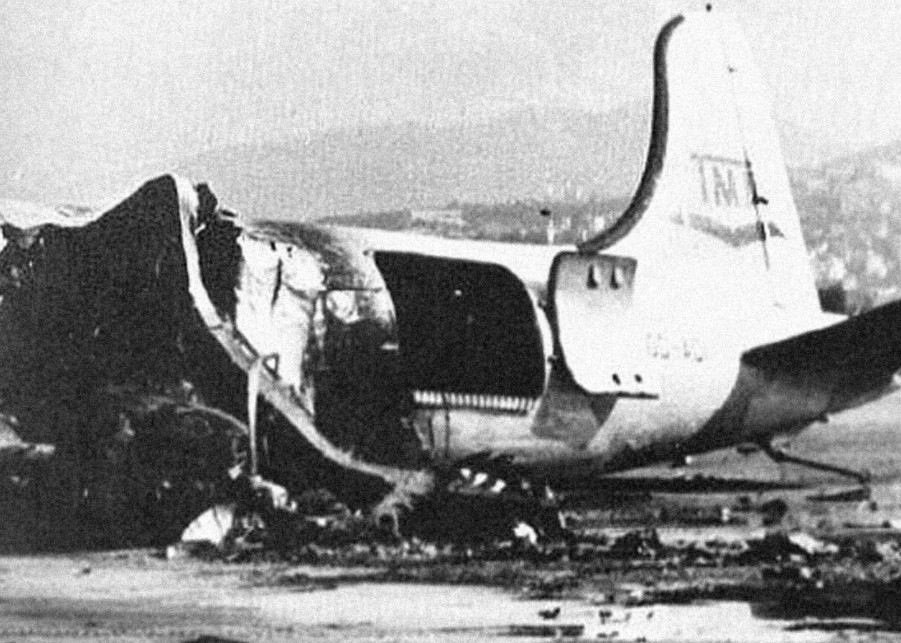 Foto rongsokan pesawat yang diledakkan oleh Sayeret Mat'kal pada Operation Gift