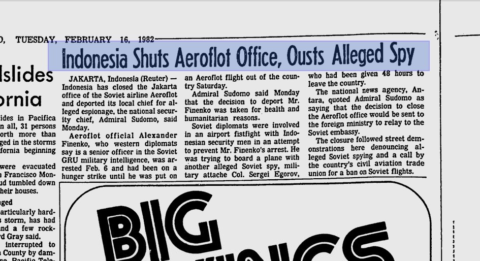 BAKIN (Badan Koordinasi Intelijen Negara, BIN saat ini) berhasil membuat prestasi dengan penangkapan agen intelijen Soviet yang melakukan kegiatan spionase di Indonesia. Target tersebut adalah agen intelijen Soviet bernama Alexander Pavlovich Finenko (36 tahun) yang di Indonesia diberi samaran sebagai manajer perwakilan perusahaan penerbangan Aeroflot yang beroperasi di Indonesia.