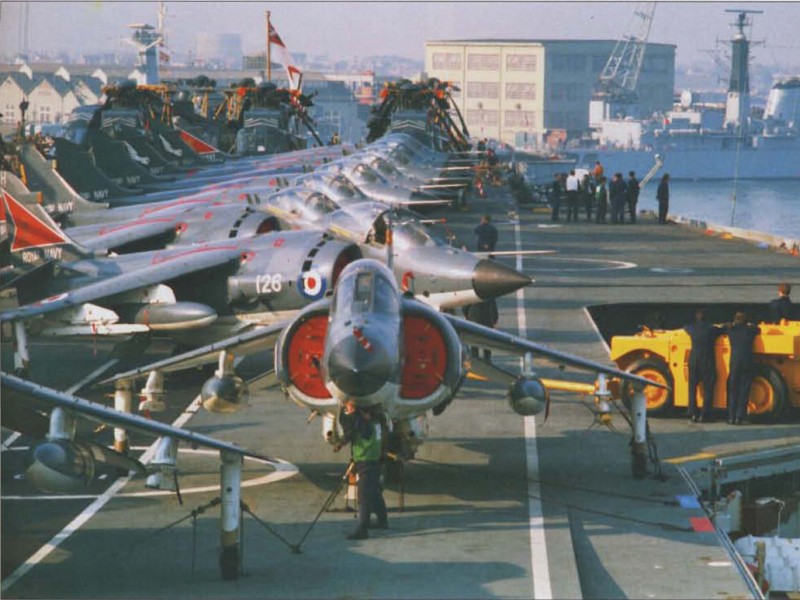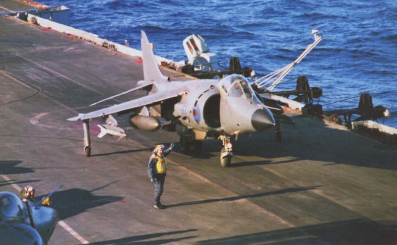 Dalam satuan tugas Angkatan Laut Inggris terdapat dua unit kapal induk yakni HMS Invincible dan HMS Hermes. Sebagai bagian dari kekuatan tersebut dibawa juga 28 unit pesawat tempur Sea Harrier milik Angkatan Laut Inggris dan pesawat tempur Harrier GR3 milik Angkatan Udara Inggris. Menerapkan konsep interoperabilitas dan pembagian peranan dalam melaksanakan operasi militer, 28 unit Sea Harrier yang ada diberi tugas menjadi payung perlindungan bagi seluruh kapal yang ada dalam satuan tugas tersebut. Sementara itu, Harrier GR3 yang dioperasikan oleh Angkatan Udara Inggris mendapat jatah tugas sebagai pesawat penggempur yang berperan menghajar sasaran darat dan memberikan dukungan udara bagi pasukan yang akan melaksanakan serangan ke daratan kepulauan Falklands. Secara umum kiprah jet tempur ini bisa dibilang menjadi sebuah kesuksesan tersendiri karena dari total 28 pesawat tempur Sea Harrier yang dikerahkan dalam operasi militer tersebut sebanyak dua unit tercatat jatuh akibat tembakan pasukan darat Argentina. Sementara sisa 4 pesawat lainnya yang terhitung dalam total 6 unit pesawat Sea Harrier yang jatuh dalam perang Falklands disebabkan adanya kegagalan mekanis dan kecelakaan.