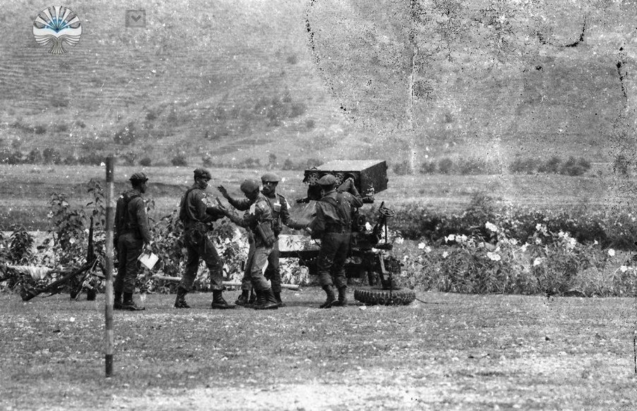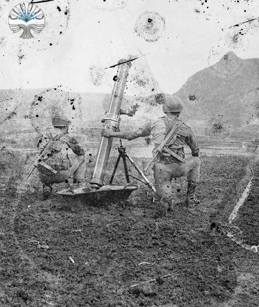 Tampak pada foto ini, personel sedang mempersiapkan mortir. Mortir di gambar ini tampaknya adalah mortir berat buatan Soviet PM-43 kaliber 120mm. Mortir ini merupakan senjata kelompok, tugasnya untuk memberikan bantuan tembakan ke perkubuan musuh.