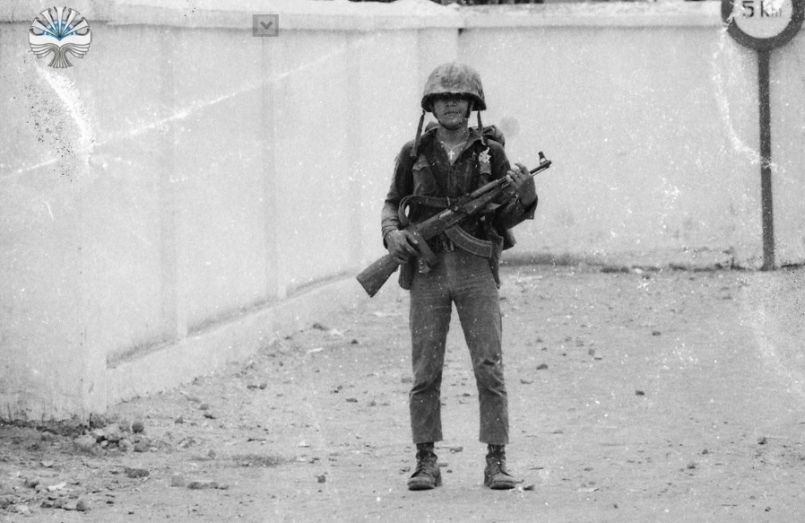 Seragam yang digunakan personel TNI/ABRI jaman itu. Lengkap dengan AK-47 popor kayu dan helm baja.