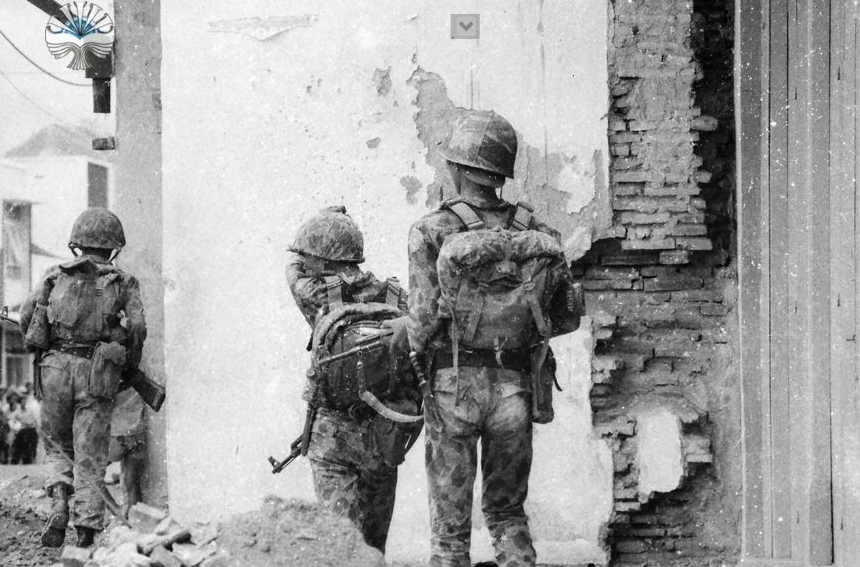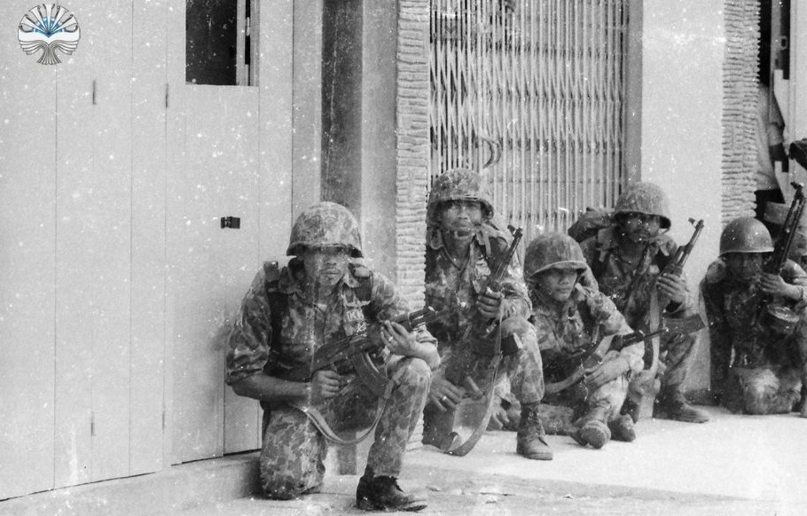 Regu KKO dengan senapan AK-47 dan sebuah RPD sebagai senapan mesin regu sedang menunggu perintah. Tampaknya yang sedang dilatihkan salah satunya adalah urban warfare, bertempur di tengah kota.