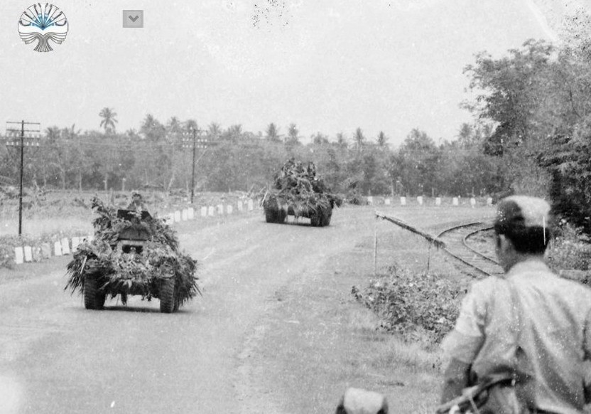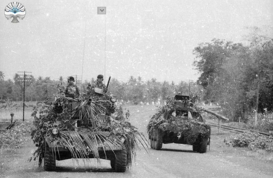 Kendaraan tempur Alvis Saladin dan Alvis Ferret berpatroli di jalanan dengan kamuflase dedaunan. Ferret dan Saladin di beli TNI dari Inggris di era 60-an. Dan hingga kini keduanya masih bertugas di satuan satuan kavaleri TNI AD.