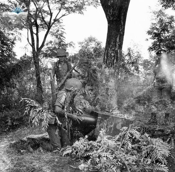 Personel ABRI sedang melakukan operasi darat pada latihan gabungan Gala Yudha 1969. Menilik seragam yang digunakan, tampaknya personel ini berasal dari KKO (Marinir TNI AL).