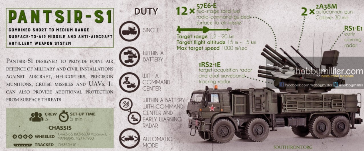 Pantsir merupakan sistem penangkal serangan udara jarak dekat dan menengah. Kiprahnya di Suriah dianggap cukup berhasil dalam melakukan penangkisan serangan serangan udara yang dilancarkan Israel dan Amerika beberapa waktu yang lalu.